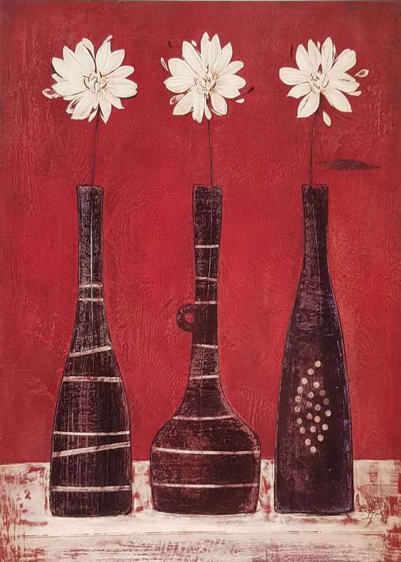 Obrázek 17x22, trojice váz s květinami, rám bílý s patinou