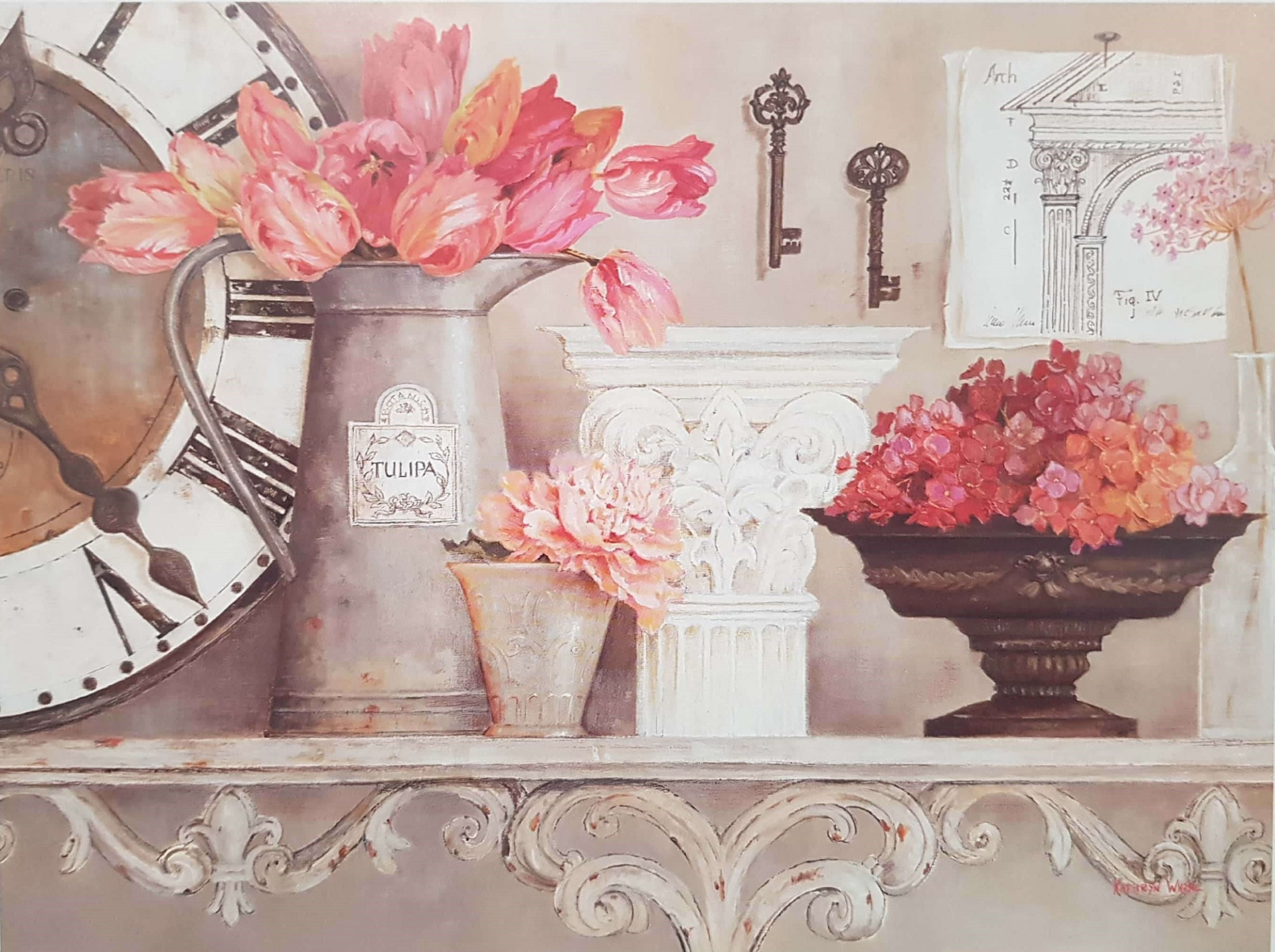 Obrázek 17x22, zátiší hodiny & květiny II., rám sv. dub - červorvotoč