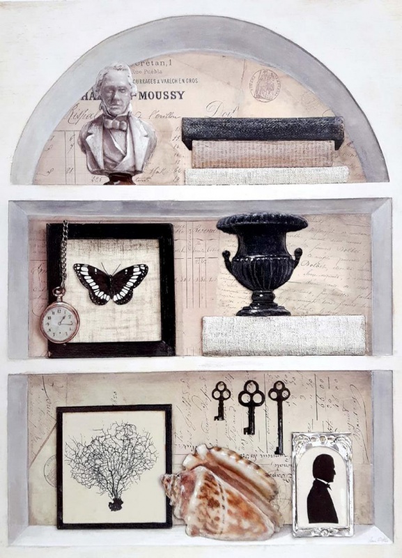 Obrázek 17x22, zátiší police I., rám bílý s patinou
