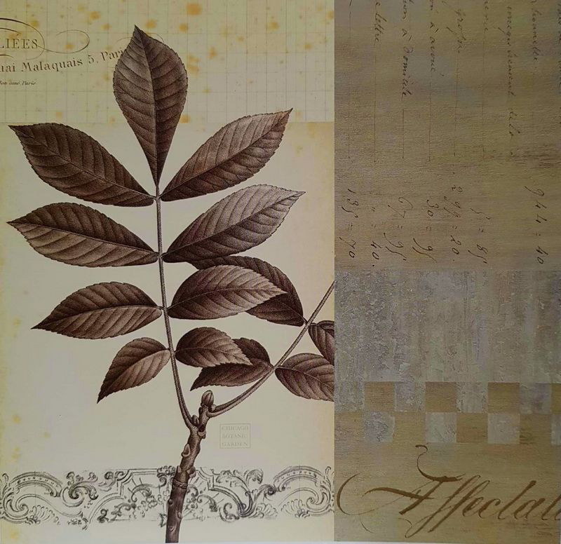 Obrázek 18x18, koláž - list ořechu, rám bílý s patinou