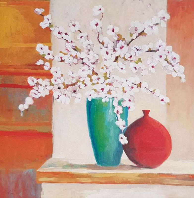 Obrázek 18x18, květy jabloně ve váze, rám bílý s patinou