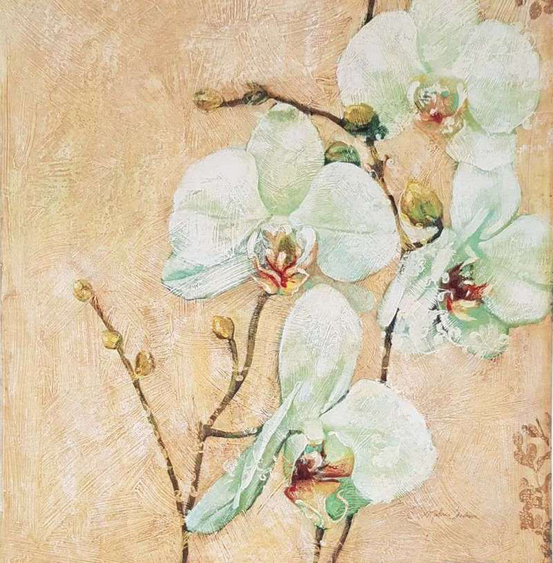 Obrázek 18x18, orchidea, rám bílý s patinou