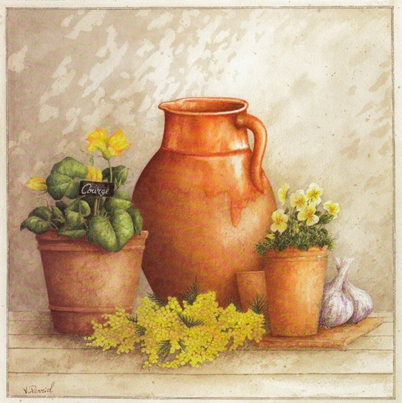 Obrázek 20x20, džbán & květiny, rám bílý s patinou