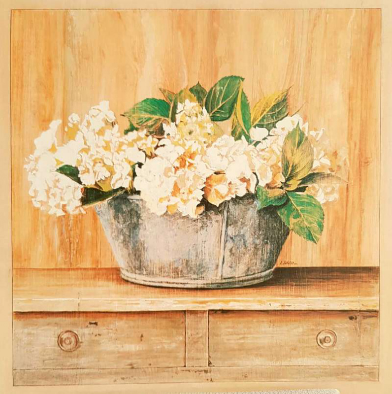 Obrázek 20x20, hortezie, rám bílý s patinou