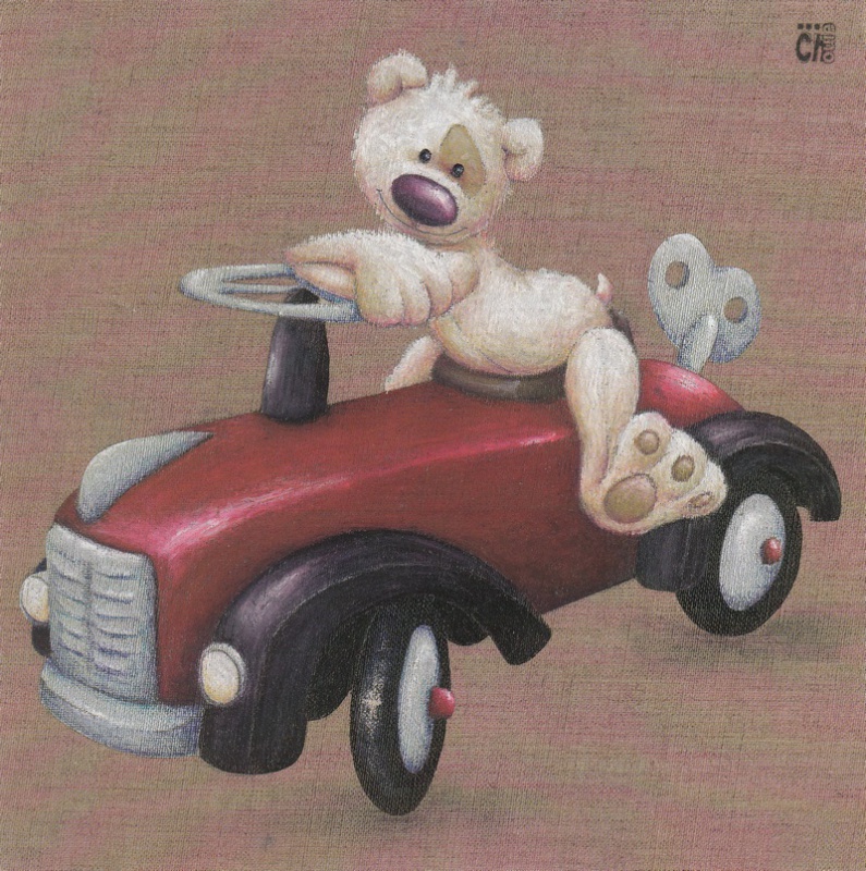 Obrázek 20x20, medvěd v červeném autíčku, rám bílý s patinou