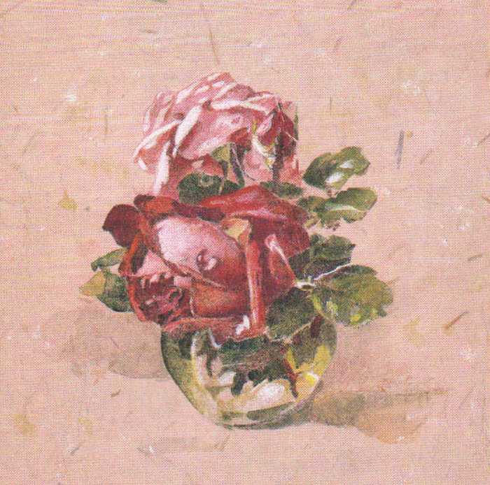 Obrázek 20x20, rudá  a růžová růže ve skleničce, rám sv. dub - červotoč