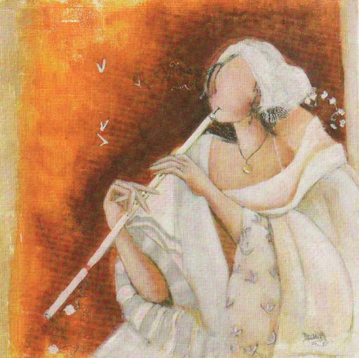 Obrázek 20x20, žena s píšťalou, rám sv. dub - červotoč