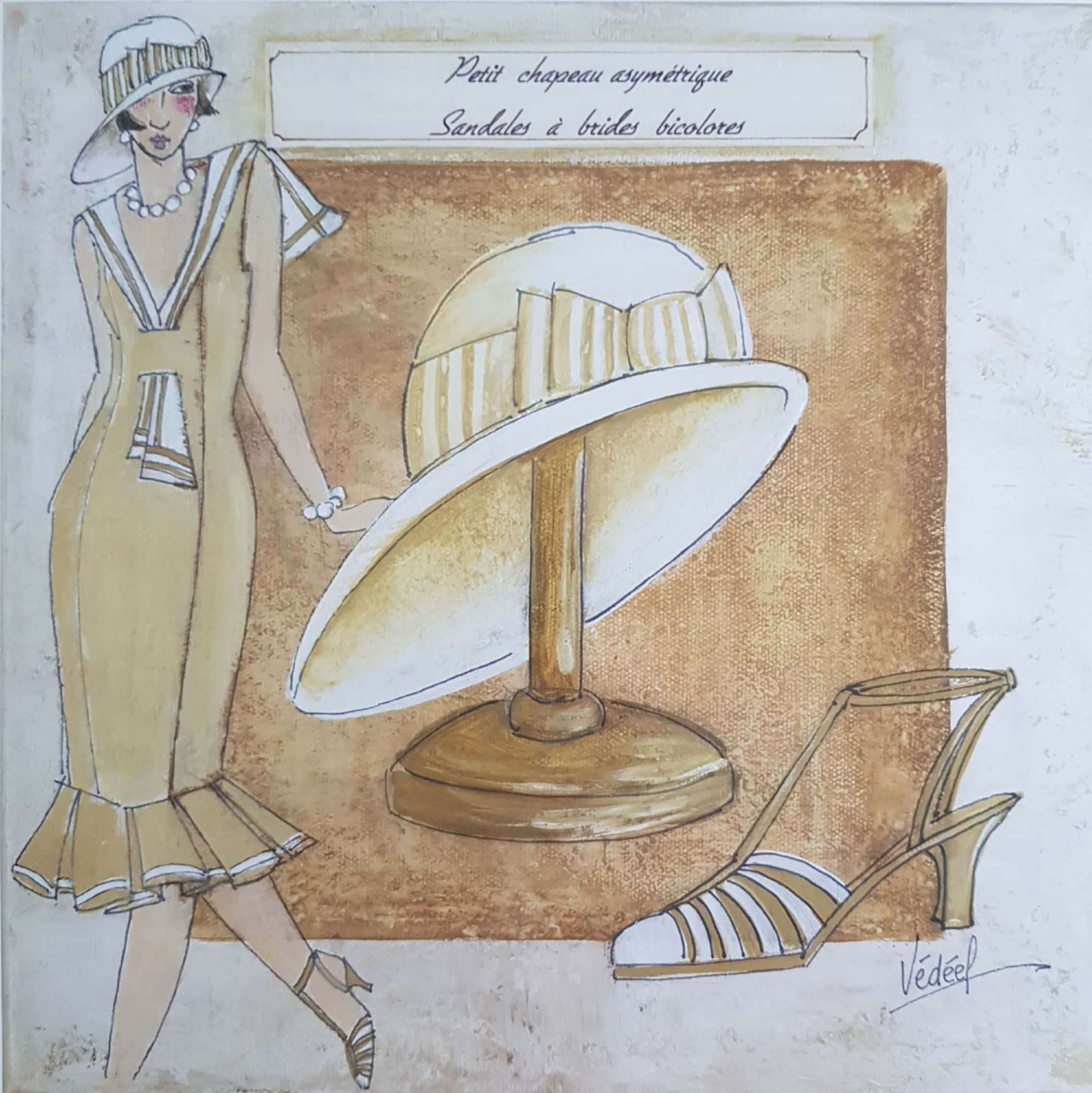 Obrázek 30x30, dáma & klobouk krémový, rám bílý s patinou
