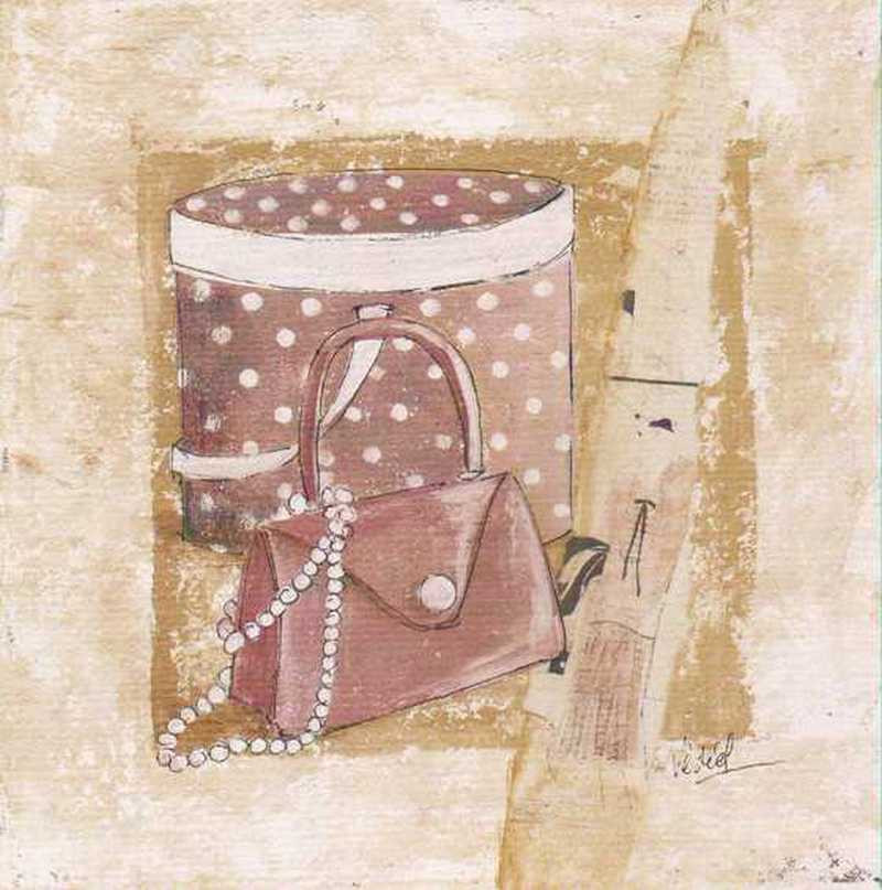 Obrázek 30x30, krabice & kabelka fialová, rám bílý s patinou