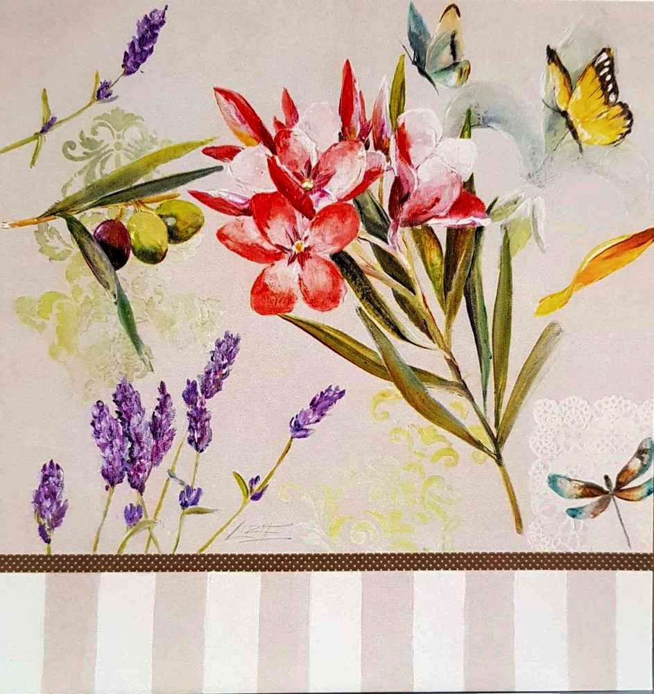 Obrázek 30x30, květiny & žlutý motýl, rám bílý s patinou