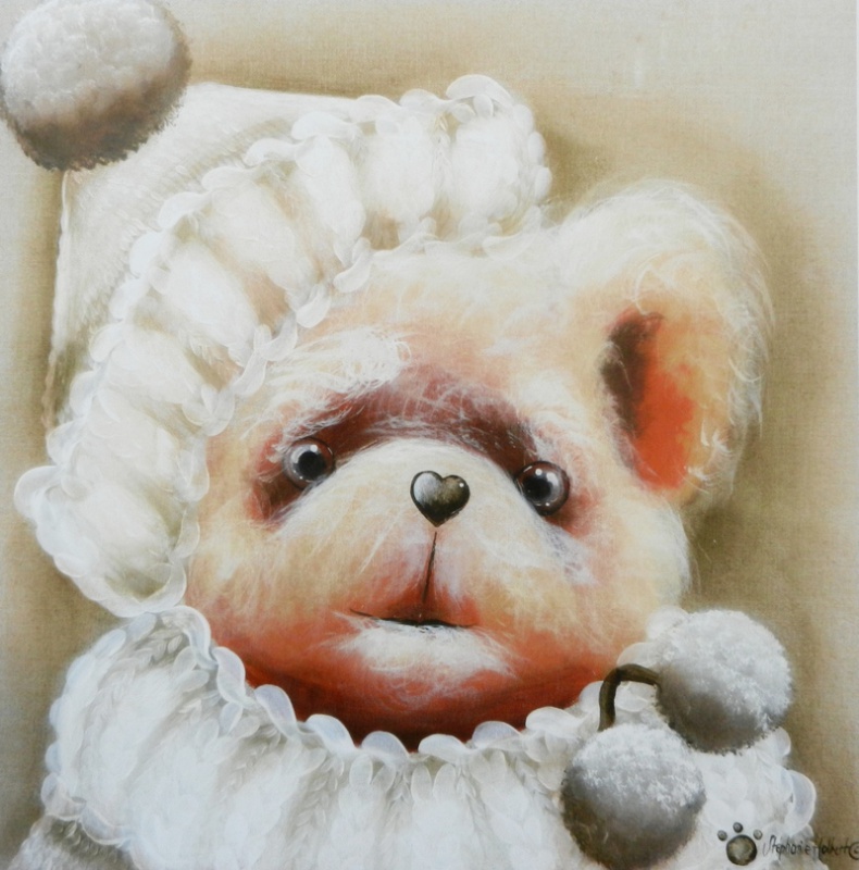 Obrázek 30x30, medvěd s bambulí, rám sv. dub - červotoč