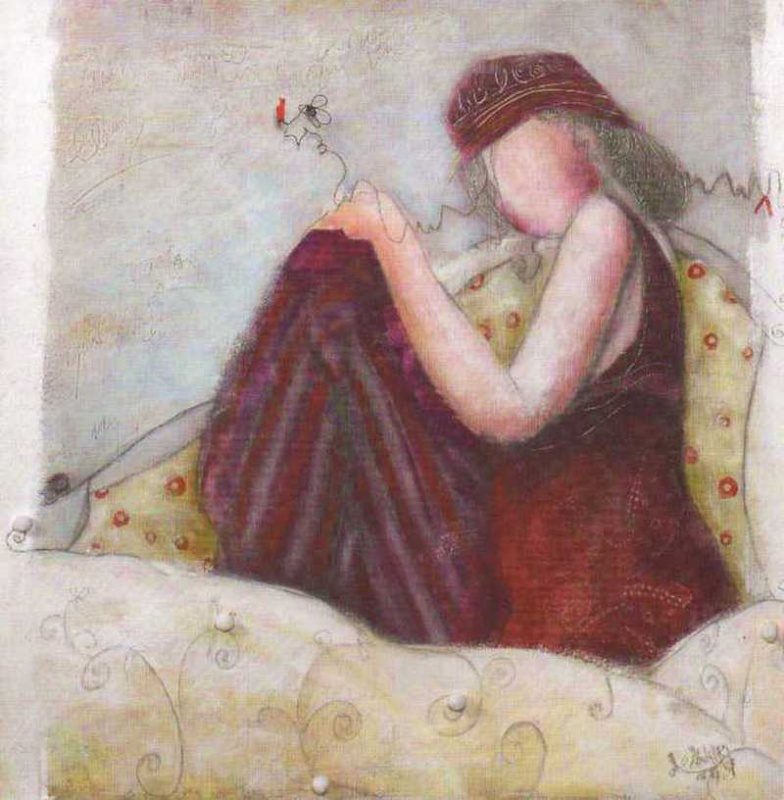 Obrázek 30x30, postava na posteli, rám bílý s patinou