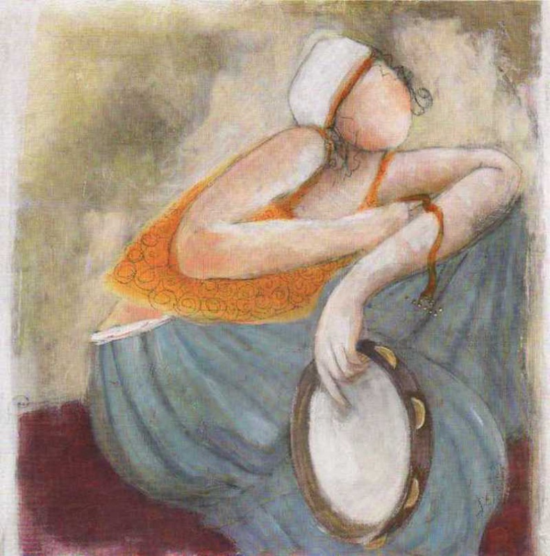 Obrázek 30x30, postava s tamburínou, rám bílý s patinou