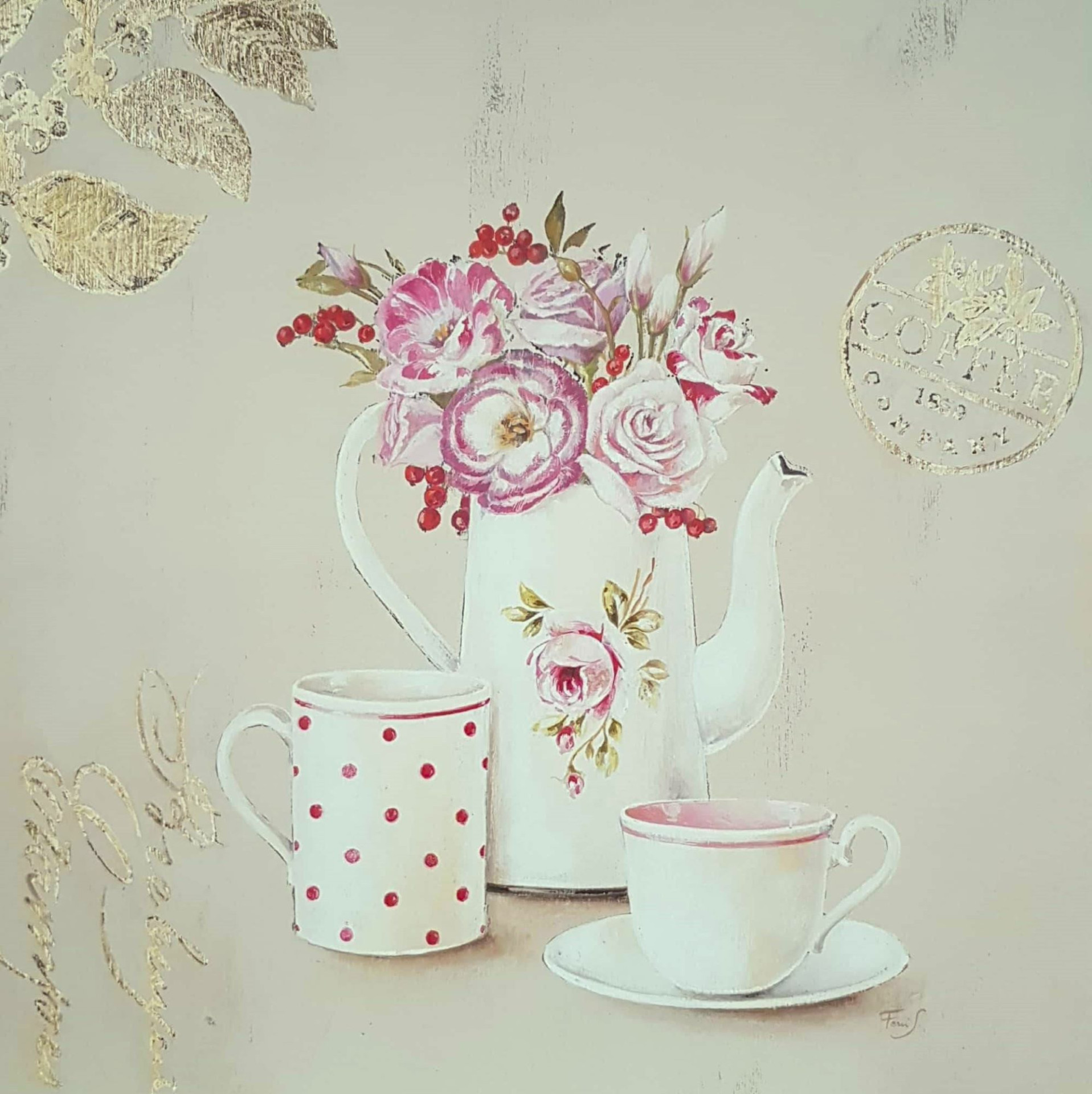 Obrázek 30x30, snídaňový set, rám bílý s patinou