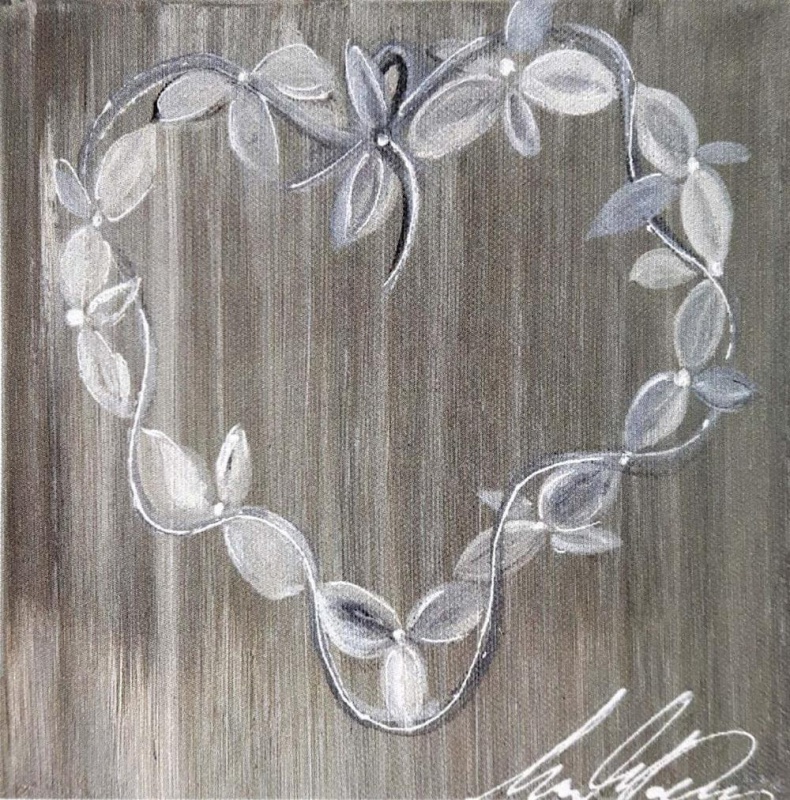 Obrázek 30x30, srdce z lístků, rám bílý s patinou