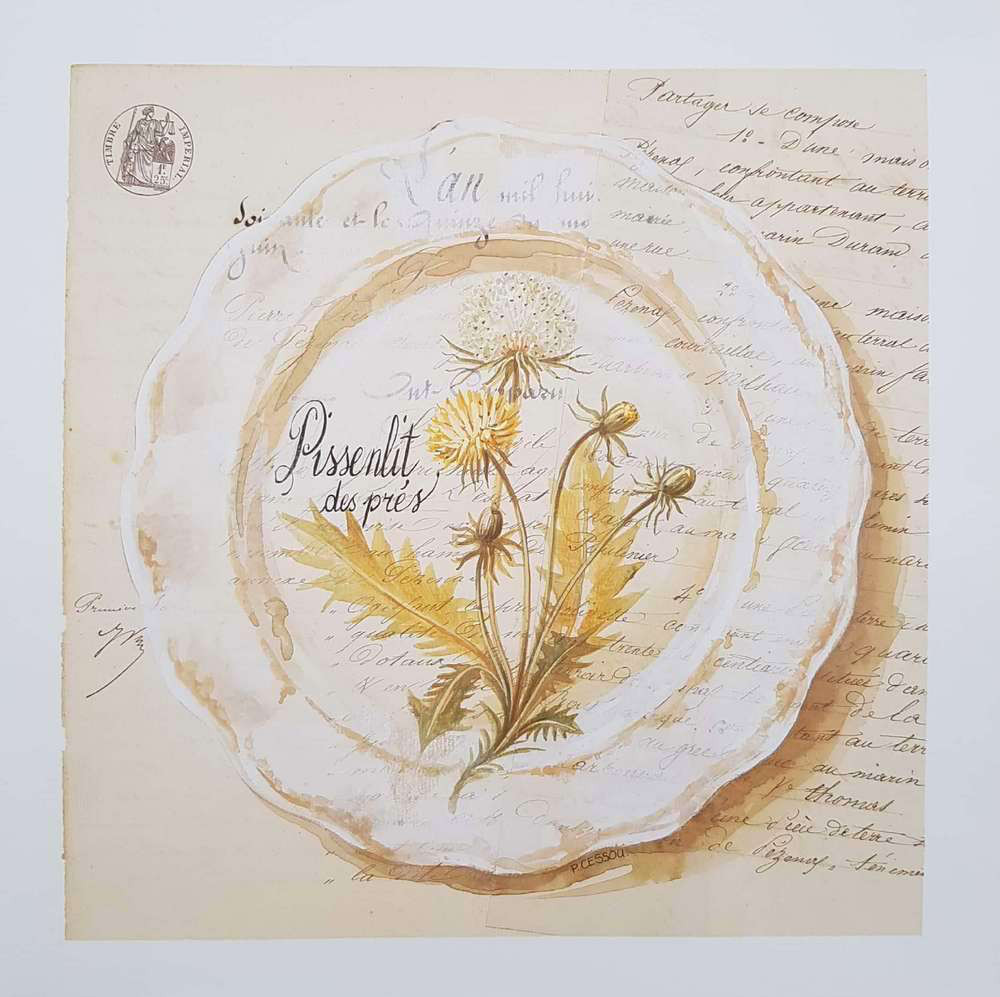 Obrázek 33x33, talíř s pampeliškou, rám bílý s patinou