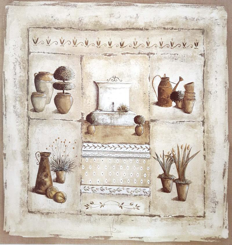 Obrázek 33x33, zahrada s fontánou, rám sv. dub - červotoč