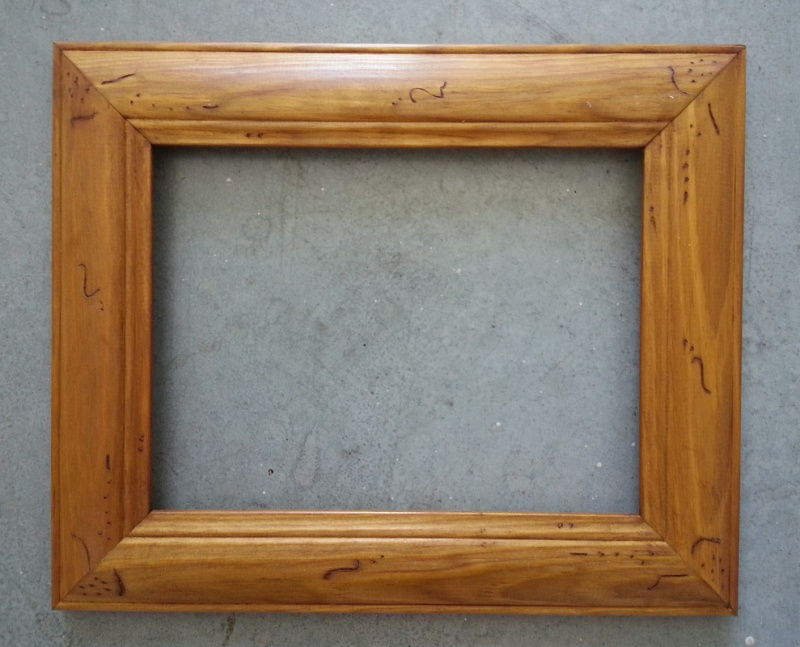 Rám je ručně voskovaný s patinou červotoče v barvě světlého dubu.