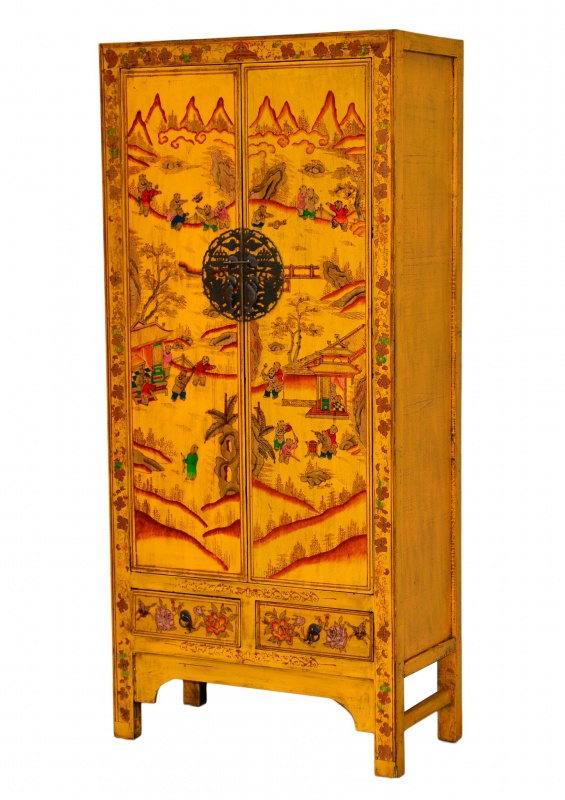 Okrově žlutá orientální skříň je přesně tím kusem nábytku, který udělá z každé místnosti pokoj s atmosférou a nádechem luxusu a exotiky. Ručně malovaná skříň z masivní dřeva s čínskými motivy života na vesnici má osobnost a je nenapodobitelná. Každý, kdo kolem ní projde se zastaví a bude si jí několik minut prohlížet. Pořiďte si neotřelá přepychový kousek a rozjasněte váš domov!