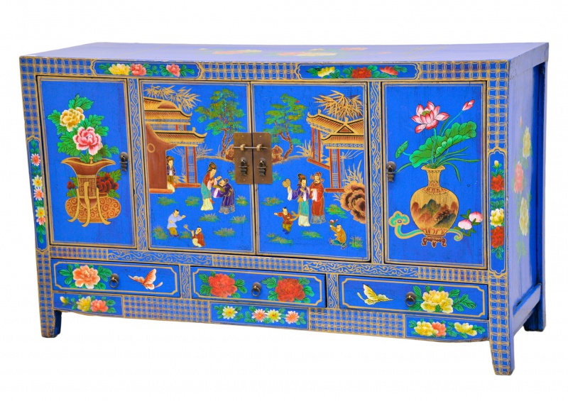 Zbožňujete prostředí, ze kterého na vás dýchá atmosféra exotiky a orientu? Přesně takový ale může být i váš domov! Nádherná modrá orientální skříňka nenechá nikoho klidným. Je ručně malovaná krásnými jasnými barvami, které ještě upevňují luxusní vzhled této komody.