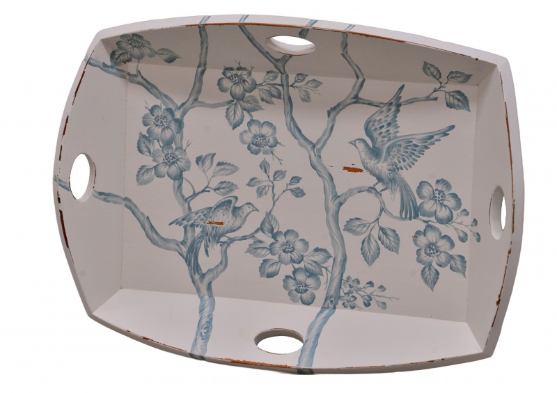 Dřevěný podnos na jídlo z mahagonového dřeva s ručně malovaným motivem modrých ptáčků může zajímavě zpestřit Vaší jídlenu či obývací pokoj při servírování. Podnos je dostatečně prostorný na několik talířků či šálků.