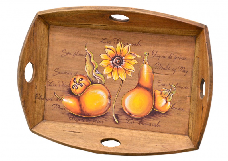 Dřevěný podnos na jídlo z mahagonového dřeva s ručně malovaným motivem dýně může zajímavě zpestřit Vaší jídlenu či obývací pokoj při servírování. Podnos je dostatečně prostorný na několik talířků či šálků.
