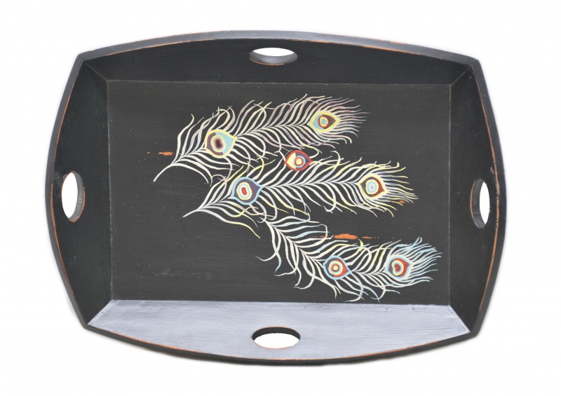 Dřevěný podnos na jídlo z mahagonového dřeva s ručně malovaným motivem pavího pera může zajímavě zpestřit Vaší jídlenu či obývací pokoj při servírování. Podnos je dostatečně prostorný na několik talířků či šálků.