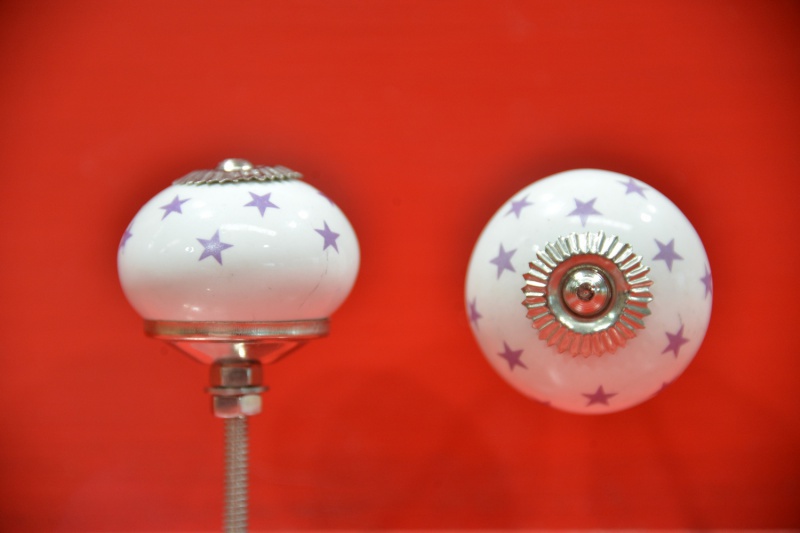 Popis produktu:Porcelánová úchytka bílá, fialové hvězdy, průměr 40mm. Dodáváno se šroubem - délka 40mm.
