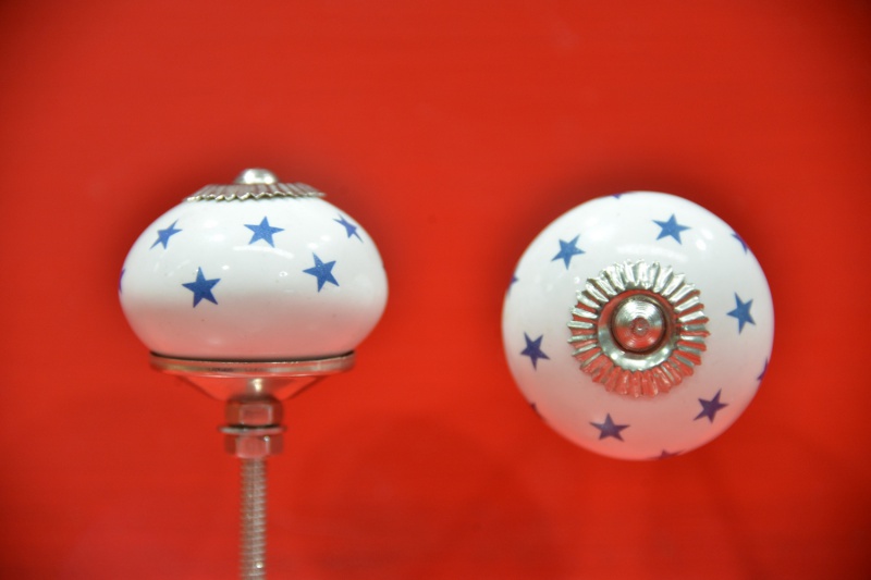 Porcelánová úchytka bílá, modré hvězdy, průměr 40mm. Dodáváno se šroubem - délka 40mm.