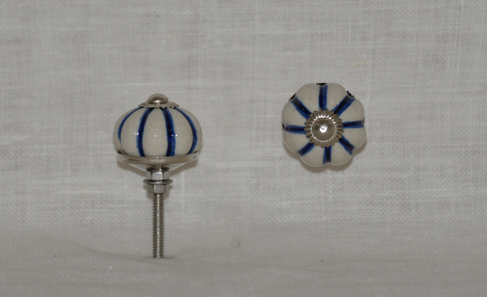 Porcelánová úchytka modré pruhy, průměr úchytky 30mm. Dodáváno i se šroubem - délka 40mm.