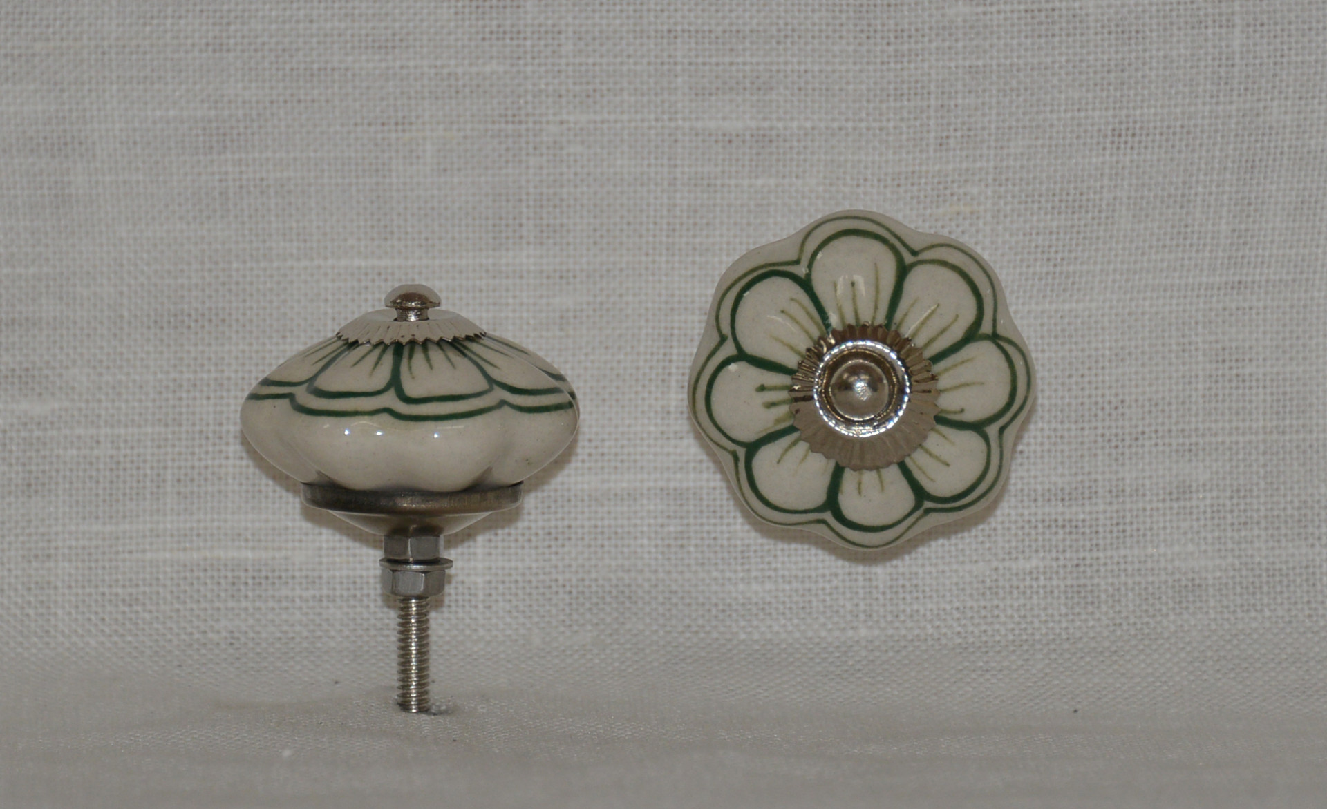 Popis produktu:Porcelánová úchytka zelený květ, průměr úchytky 45mm. Dodáváno i se šroubem - délka 40mm.