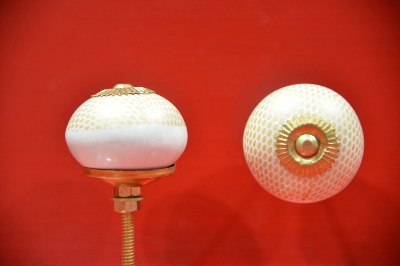 Porcelánová úchytka bílá, zlaté tečky, průměr 40mm. Dodáváno se šroubem - délka 40mm.