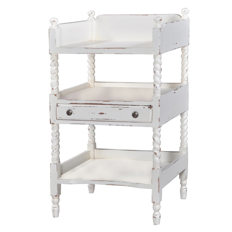 Malý regál MaJune je vyroben z mahagonového dřeva a je nabarven do bílé zestařené barvy.