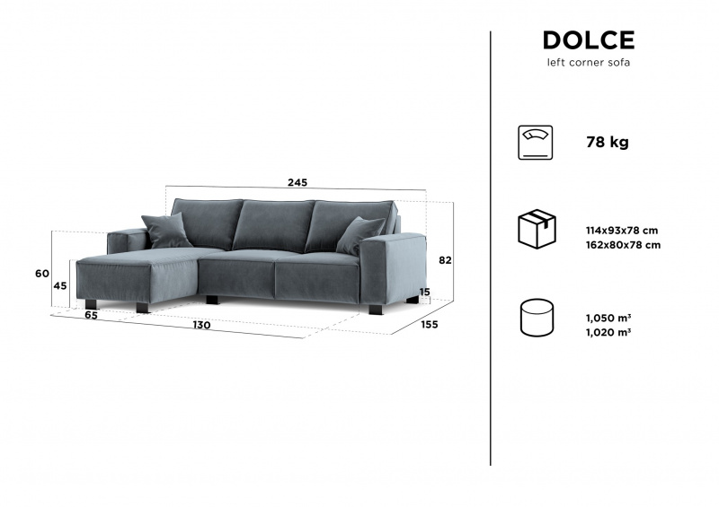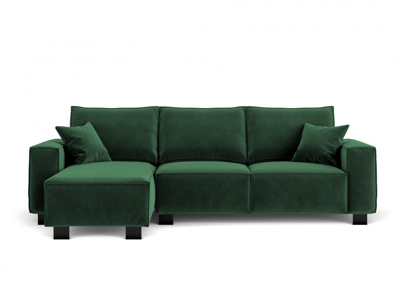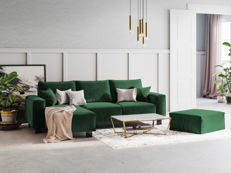 Rohová pohovka Dolce v sametové látce v sytě zelené barvě je ta nejlepší volba pro toho, kdo požaduje designový kousek a zároveň praktické posezení do interiéru. Samet je na omak velice hladký a lesklý, sedačka může být čištěna i mokrou cestou či pomocí chemických prostředků. Roh této sedačky je na levé straně.