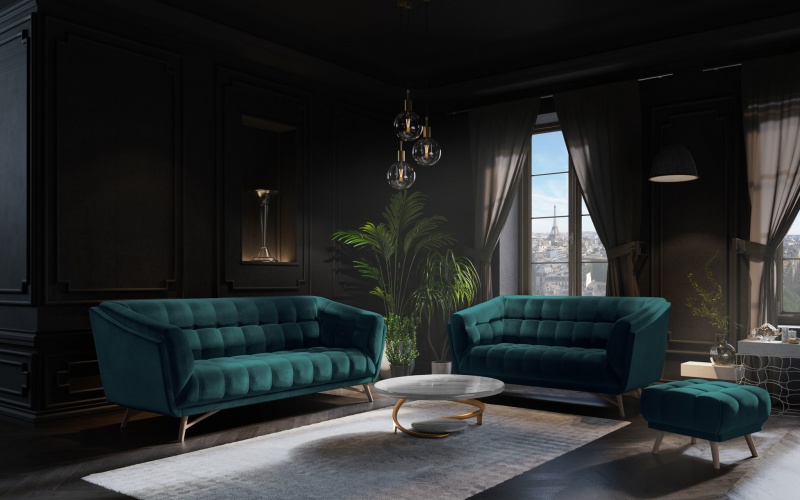 Pohovka Etoile v sametové látce v tmavě modro-zelené barvě je ta nejlepší volba pro toho, kdo požaduje designový kousek a zároveň praktické posezení do interiéru. Samet je na omak velice hladký a lesklý, sedačka může být čištěna i mokrou cestou či pomocí chemických prostředků.