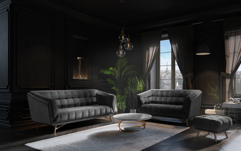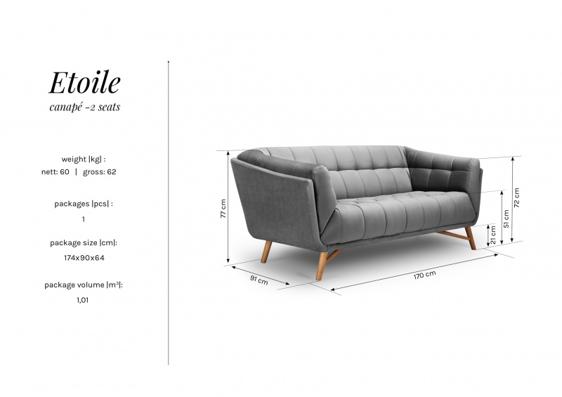 Pohovka Etoile v sametové látce v tmavě šedé barvě je ta nejlepší volba pro toho, kdo požaduje designový kousek a zároveň praktické posezení do interiéru. Samet je na omak velice hladký a lesklý, sedačka může být čištěna i mokrou cestou či pomocí chemických prostředků.