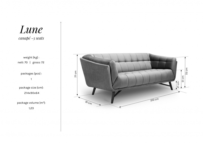 Pohovka Lune v sametové látce ve světle šedé barvě je ta nejlepší volba pro toho, kdo požaduje designový kousek a zároveň praktické posezení do interiéru. Samet je na omak velice hladký a lesklý, sedačka může být čištěna i mokrou cestou či pomocí chemických prostředků.