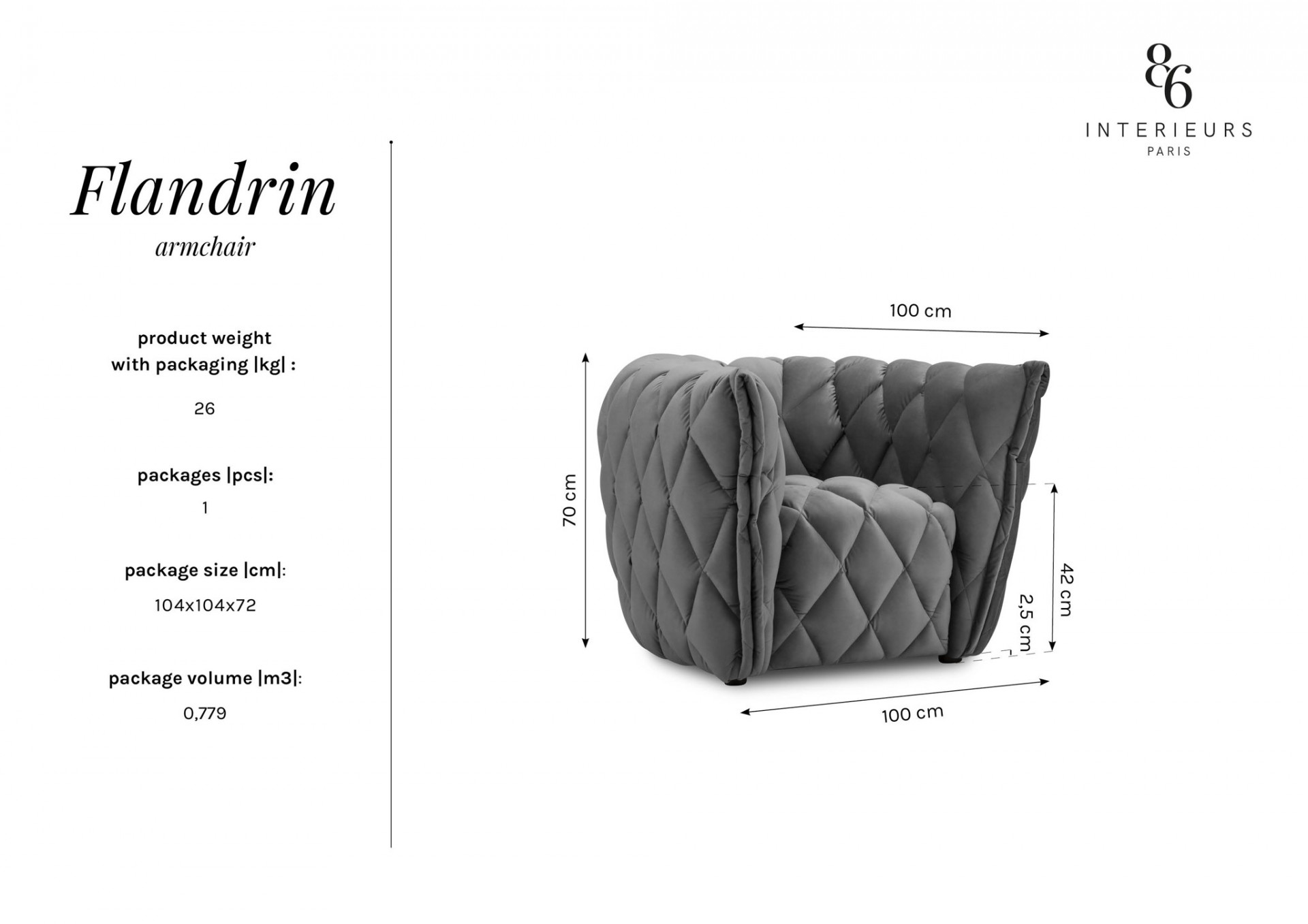 Sametové křeslo Flandrin v světle šedé barvě je ta nejlepší volba pro toho, kdo požaduje designový kousek a zároveň praktické posezení do interiéru. Samet je na omak velice hladký a lesklý, křeslo může být čištěno i mokrou cestou či pomocí chemických prostředků.