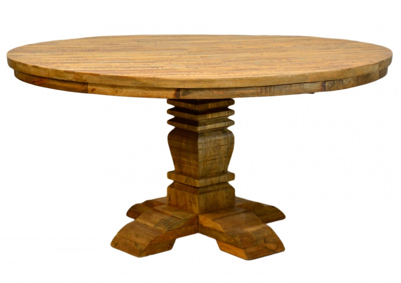 Set kulatého stolu Guru z masivu a čtyřech židlí Sawan je to pravé, co pozvedne Vaší kuchyň či jídelnu! Neobvyklý stůl v retro patině je vyroben z masivního dřeva, vyřezávaná noha se zajímavým tvarem bude obdivovaná každou návštěvou. Vytvořte si ve vaší jídelně vintage atmosféru.