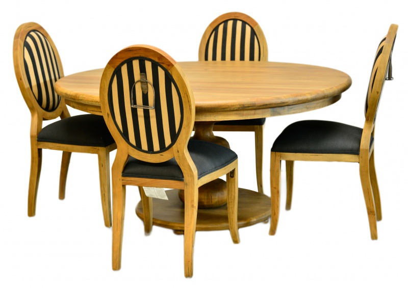 Jak už napovídá samotný název židlí v tomto okázalém jídelním setu, při pohledu na něj se člověku může vybavit jediné. Majestátní kolektivní sport s hlubokými anglickými kořeny, majestátní zvířata a jejich týmově odění jezdci - Pólo. Ať už jste vášnivými jezdci, milovníky koní, nebo jen zbožňujete okázalost vznešené Anglie, je tento vkusný a přepychový set ideální volbou. Za každou cenu se díky němu můžete cítit jako vážení angličtí šlechtici a spokojeně pojídat lahodné pokrmy v zajetí této nenahraditelné atmosféry. Set se skládá z kulatého stolu Carlo a čtyř židlí, které jsou vyztužené výstižnou pruhovanou látkou a ozdobené pravými jezdeckými třmeny. Tak jednoduchá kombinace sama o sobě hravě postačí k utvoření tolik osobitého dojmu. Set je z luxusního mahagonového dřeva světlé přírodní barvy, které disponuje vysokou kvalitou a zaručuje dlouholetou životnost produktu.