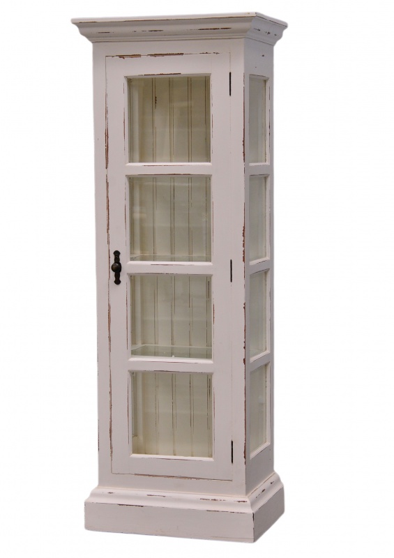Skleník Ashton v bílé patině a probrušovanými hranami je vyroben z mahagonového dřeva, police jsou skleněné, zafrézované do dřeva. Skleník má zdobnou kovovou úchytku a každá tabulka skla je s jemnou pohledovou fazetkou na okraji.