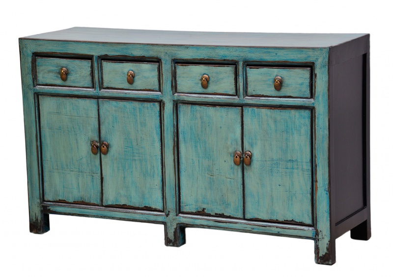 Robustní komoda se čtyřmi zásuvkami a úložným prostorem zaujme v jakékoliv místnosti. Je vyrobená z krásného masivního dřeva v tyrkysové barvě s výraznou stylovou patinou. Skříňka ve stylu Provence udělá z vašeho obývacího pokoje či ložnice útulnou místnost, ve které si budete připadat jako na jihu Francie během léta.
