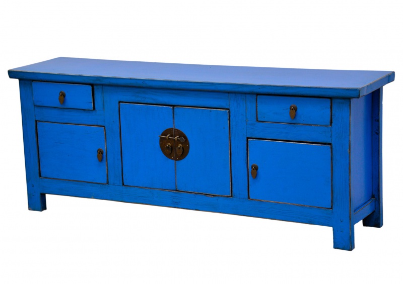 Skříňka z masivního dřeva ve výrazné, jasně modré barvě, doladí vaši ložnici či obývací pokoj k dokonalosti. Zajímavě řešené úložné prostory i neotřelá barva zajistí, že se vám skříňka neokouká a při každém pohledu na ni se do ní znovu a znovu zamilujete. Provence komodu dolaďují kovové úchyty a zajímavé řešení zavírání největší skříňky.