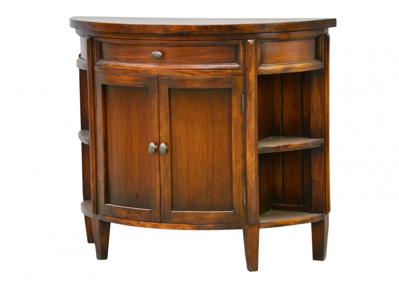 Vyzdobte svůj interiér elegantním a především majestátním rustikálním stolkem, který vám prakticky poslouží jak svým úložným prostorem, tak i poličkami vhodnými pro vystavení čehokoli, co se rozhodnete dát na odiv očím všech vašich návštěvníků. K tomu vám poslouží vrchní plocha stolku i roztomilé rohové poličky. Stolek Cocktail, podobající se praktické komodě, má zajímavý půlkruhový tvar a je vyroben z mahagonového dřeva, které zajišťuje jeho dlouholetou kvalitu a nosnost. Je v tmavší hnědé barvě se světlejšími odlesky.