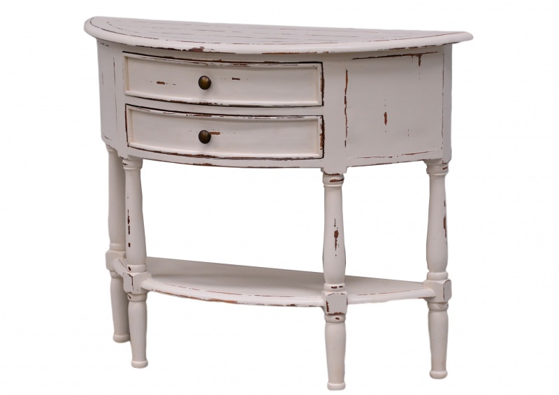Vkusný půlkruhový stolek Demi-lune se hodí do každé seriózní pracovny, či obývacího pokoje, a to právě díky své jednoduché kráse. Vyrobený je z mahagonového dřeva a pyšnit se může krásnou bílou patinou. Skvěle doladí místnost, a podpoří její vybraný, luxusní design! Stolek obsahuje dvě praktické zásuvky a jednu poličku, a tak poslouží i jako vhodný pomocník pro úschovu vašich dokumentů.