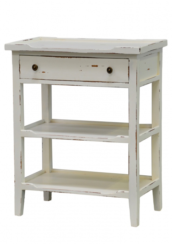 Mahagonový stolek v Provence stylu se dvěma poličkami a praktickou zásuvkou doladí váš domov k dokonalosti. Báječně poslouží jako odkládací plocha nebo konferenční stolek v obývacím pokoji, ložnici či pracovně. Je natřen bílou barvou s oprýskaným efektem, která jen umocňuje jeho romantický charakter a podtrhuje krásu jeho jednoduchosti.
