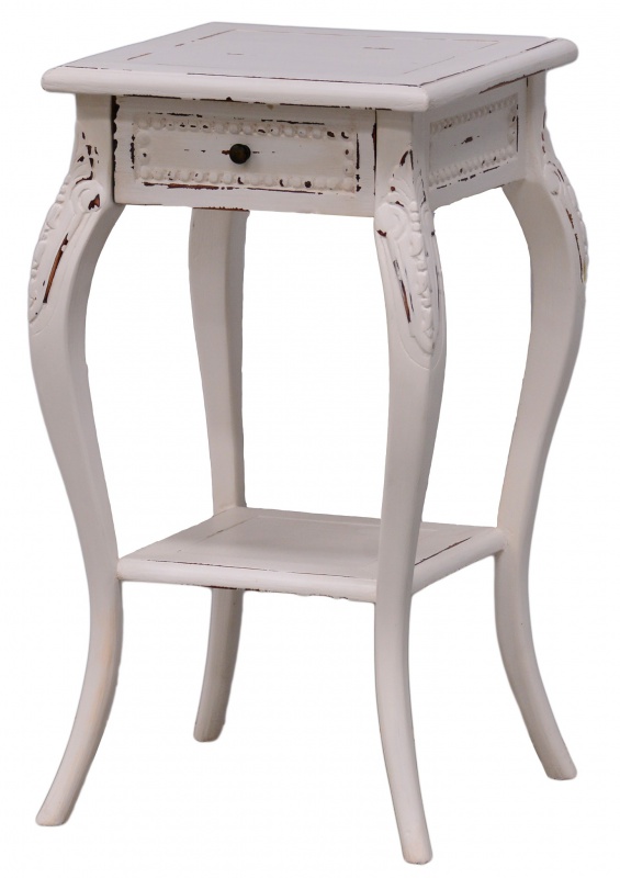 Stolek Francoise ve stylu Provence je malý stolek do vašeho interiéru, je vyroben z mahagonového dřeva v bílé patině. Stolek je unikátní vyřezávanými nohami a ladnými křivkami. Stolek má jeden malý šuplík.