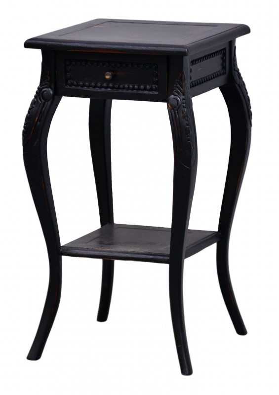 Stolek Francoise ve stylu Provence je malý stolek do vašeho interiéru, je vyroben z mahagonového dřeva v černé patině. Stolek je unikátní vyřezávanými nohami a ladnými křivkami. Stolek má jeden malý šuplík.
