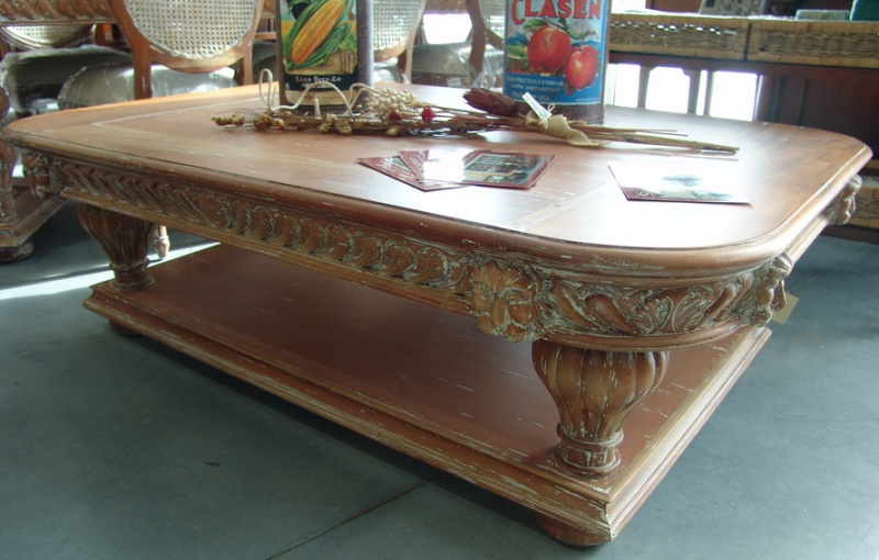 Stolek Gothic, zestařená patina, řezby na celém lubu stolu pod deskou.