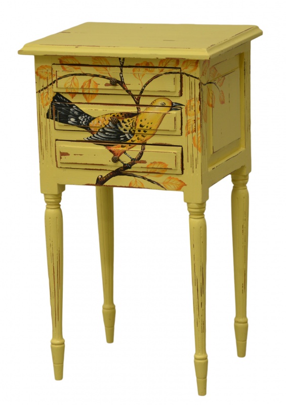 Jste jemná duše, která miluje romantický styl? Pořádně si prohlédněte tento úchvatný provence stolek ve žluté barvě s motivem ptáčka. Je vybarven krásnými teplými odstíny a je snadno kombinovatelný se světlým i tmavým interiérem. Stolek je vyroben z mahagonového dřeva, má tři praktické zásuvky a odkládací prostor na lampu či vázu s květinami. Zútulněte svůj domov tímto výjimečným kouskem.